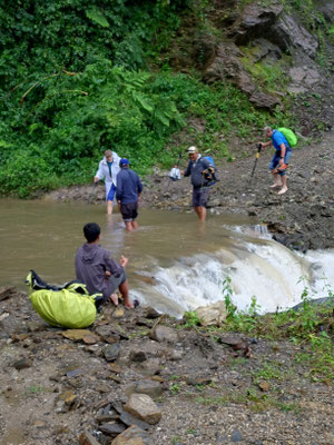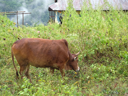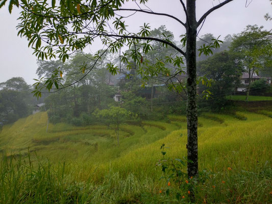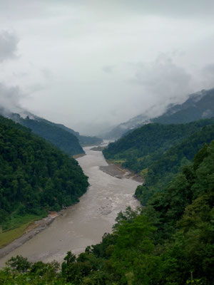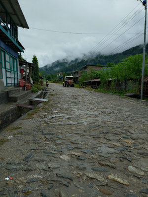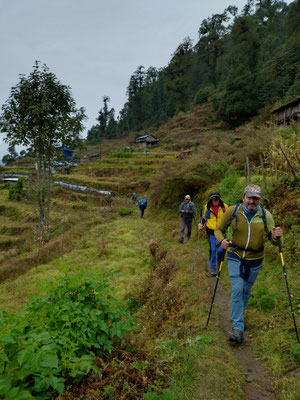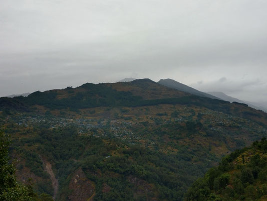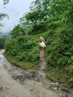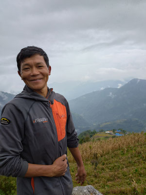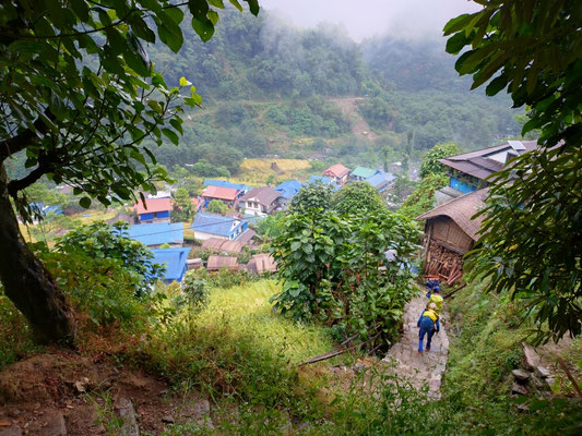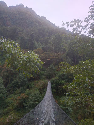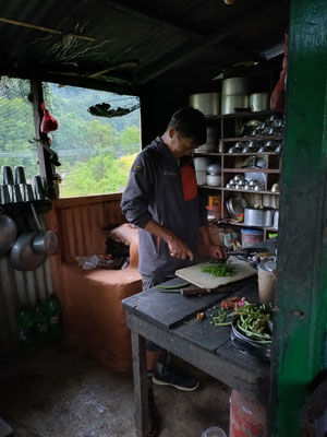 Die letzte Woche war aber sehr abwechslungsreich. Nachdem wir Chheskam verlassen haben liefern wir zuerst 900 Meter hinunter und auf der anderen Talseite wieder 1000 Meter hoch. Der nun folgende Höhenweg war wunderschön. Da hat es auch noch nicht geregnet. Nach einer guten Nacht liefen wir am nächsten Tag weiter. Im stetigen auf und ab, begleitet von Nieselregen bewegten wir uns durch die wunderschöne Landschaft. Leider war am höchsten Punkt auf 3500 Meter das Wetter zu schlecht, um die Berge zu sehen. Es wären Makalu und Everest zu sehen gewesen. Nach dem Pass ging es auf glitschigen Steinen den Berg hinunter. Rund 1500 Höhenmeter tiefer war unsere Lodge. Vorher war noch der Ort zu sehen, wo Dendi (unser Hilfsguide) aufgewachsen ist. Ein keiner Ort mit 16 Häuser. Jetzt Leben nur noch 3 Menschen dort. Dendi ist ganz einfach und ohne Schulbildung aufgewachsen. Noch immer kann er nicht lesen. Mit anfangs 20 verliess er das Dorf um in Kathmandu Fuss zu fassen. Bald lernte er die richtigen Leute kennen und kam so in die Tourismusbranche. Als Träger angefangen, ist er mittlerweile ausgebildeter Bergführer. Auch wenn er weder schreiben noch lesen kann. Eine eindrückliche Lebensgeschichte. Vorallem wenn man gesehen hat wo er aufgewachsen ist. Auf jeden Fall haben wir die Lodge triefend nass erreicht. Der nächste Tag startete im Regen. Als wir einen Bach überquerten mussten wir die Schuhe ausziehen, da es keine Brücke hatte. Das sind noch abenteuerliche Ferien. Der Regen machte eine Pause und wir erreichten den nächsten Ort nur nass vom Schwitzen. :) Auch diese Unterkunft ist sehr Basic. Mein Zimmer ist ein Raum aus Blech, als Fenster haben sie ein Loch ausgesagt. Aber eines ist sicher das Essen ist immer wunderbar. Kaum nach Ankunft nimmt unser Team die Küche in Beschlag und kocht uns aus einfachen Zutaten ein wunderbares essen. Heute erreichten wir dann Tumingar. Von hier werden wir dann zurück nach Kathmandu fliegen, es hat einen Flughafen. Der Weg hierhin war auf der matschigen Strasse. Ich lief in den Crocs was eine sehr gute Entscheidung war. Morgen verlassen wir also die tiefe Region und verlassen auch die Reisfelder, Bananenpflanzen und das Grünland. Obwohl es für uns Bergler sehr interessant war. Mit dem Jeep fahren wir in 4 Stunden nach Num, dass auf 1500 Meter liegt. Dabei überqueren wir einen Pass auf 2500 Meter. Bei gutem Wetter wird eine schöne Aussicht versprochen. Dänn am Montag laufen wir Richtung Makalu Basis Lager auf 4800 Meter. Empfang werden wir nicht mehr haben. Ich schreibe dann wieder, wenn wir unser Trekking beendet haben.